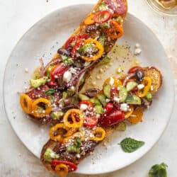 My mouth is watering just looking at these photos again! Super crunchy, garlicky baguettes grilled until toasty and topped with the most flavorful salad filled with tomatoes, sweet peppers, cucumbers, olives and more.