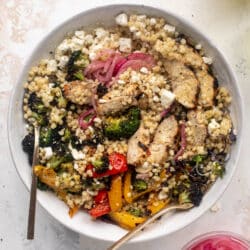I live for a good bowl meal, so we’re throwing our grilled lemonade chicken on top of a bowl of couscous with a lemonade dressing, some grilled vegetables, cheese and a few toppings. Satisfying, easy, versatile and customizable! That’s the name of the game over here and we love it.
