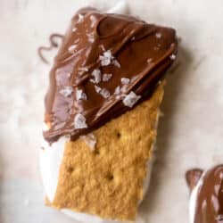 • Remove the graham sandwiches from the fridge. Dip half in the melted chocolate. Sprinkle with flaked salt. Let sit and firm up or chill/freeze if desired. Enjoy!