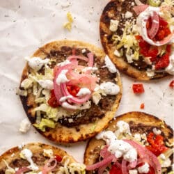 Toppings time! Add whatever you love – shredded lettuce and roasted red peppers are a must for us. You could also add cucumbers and hummus. A drizzle of the yogurt feta sauce is everything. Finish with pickled onions, for sure.