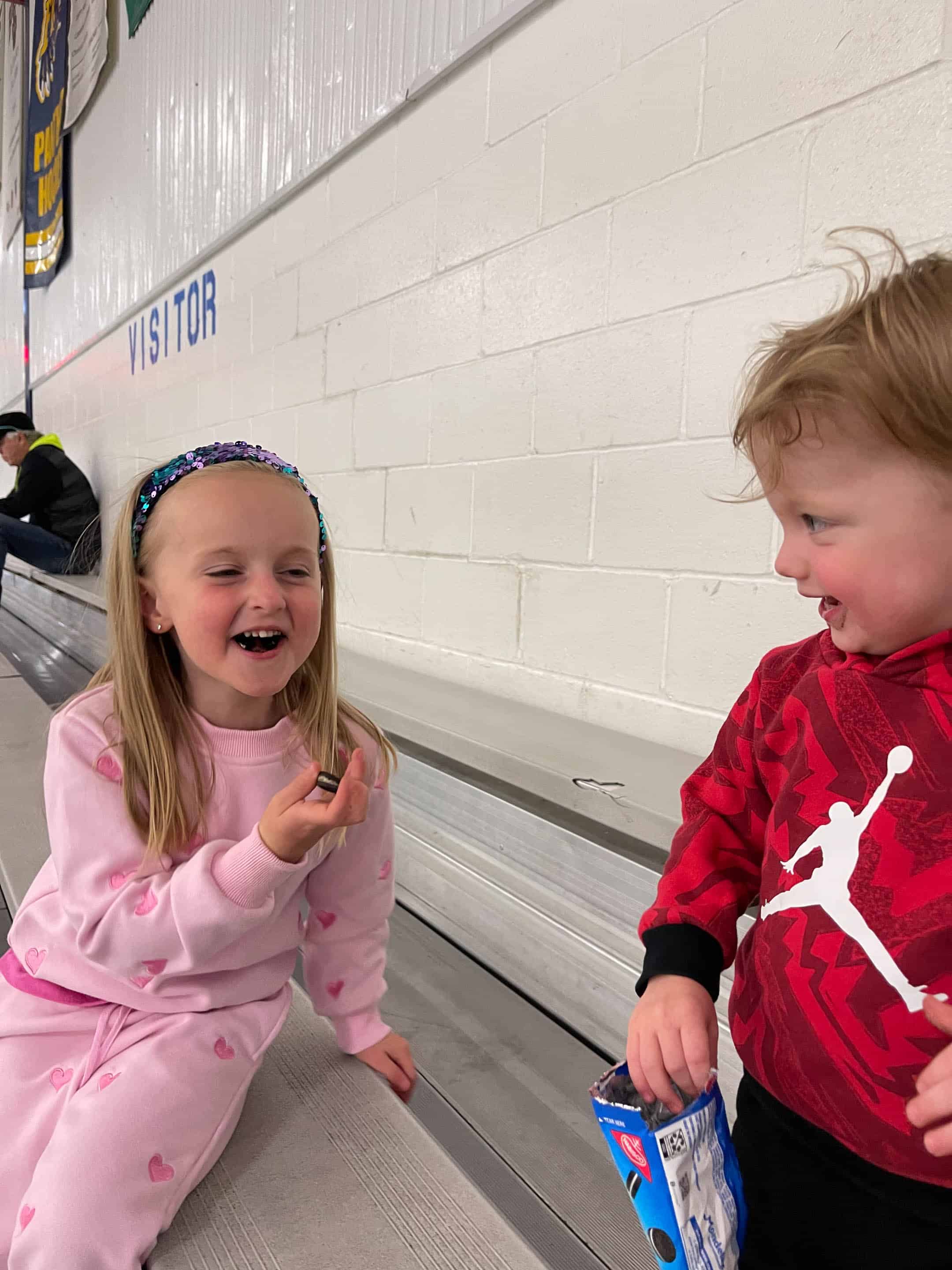 These two play together so well during Max’s hockey practice. Jordan convinced her for some “baby oreos,” as he calls them.