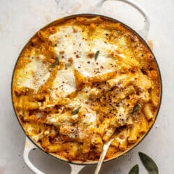 This baked ziti has a creamy and rich pumpkin sauce, then is topped with burrata cheese and baked until melty, creamy and so utterly perfect that you will want to eat it once a week!
