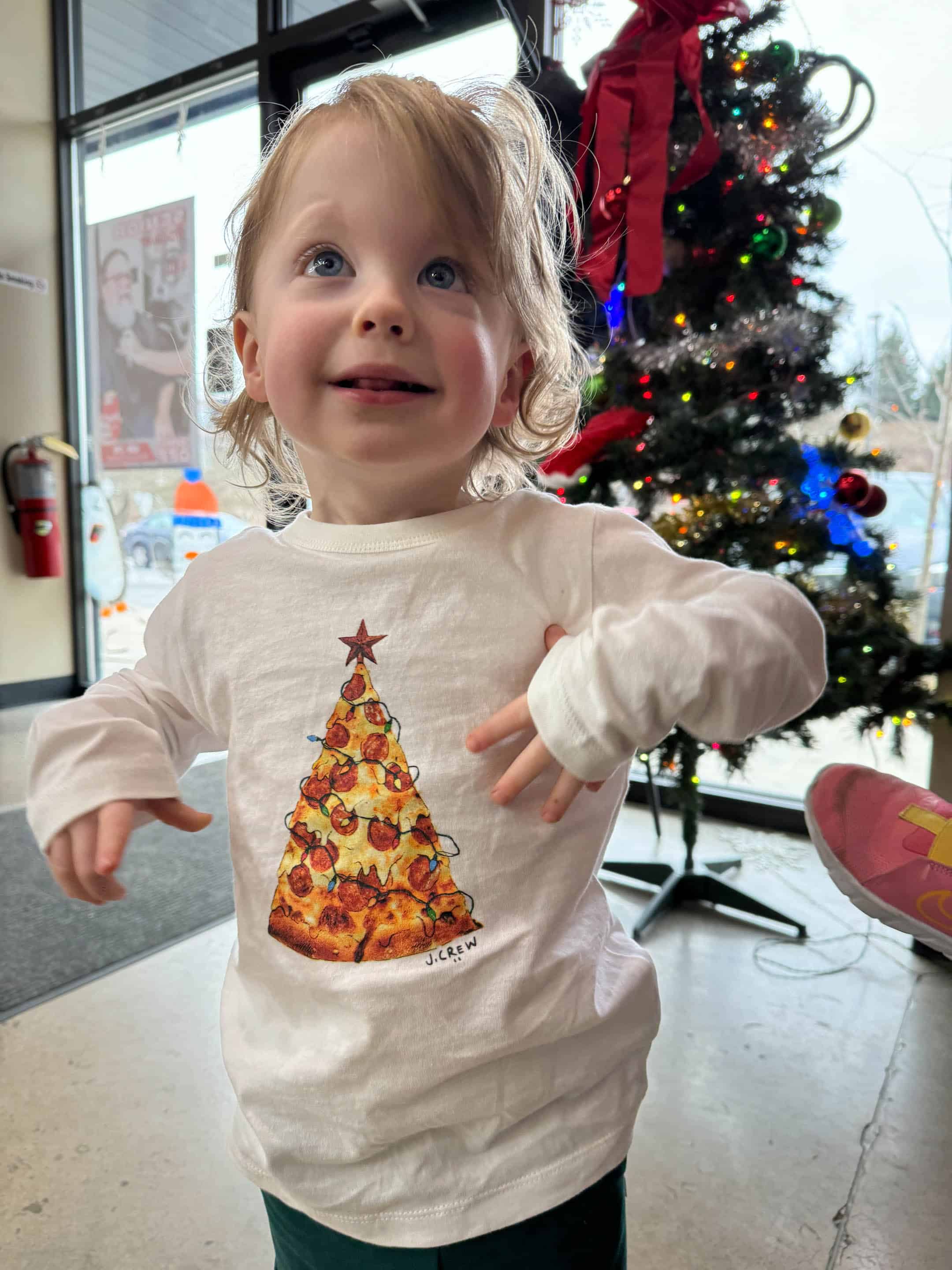 Happy Holidays. Great pictures of your beautiful family. Thanks for sharing as it brings back memories of my three littles (now adults) and the excitement that was Christmas. I want Jordan’s pizza tree shirt in an adult size! LOL.