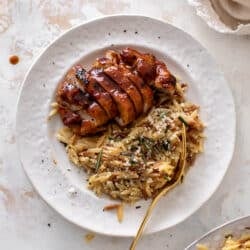 A word of caution- the orzo was delicious but 1/4 cup of rosemary was way too much rosemary for my taste. I even reduced by half out of caution, and that much overpowered the dish. If rosemary is your favorite herb, then get after it- if you like just a tolerable amount of rosemary, reduce by at least half. I saw a similar comment on Instagram and wanted to make sure others were aware!