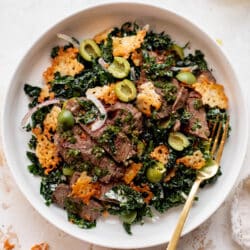 This kale steak salad is absolutely delicious! Creamy chimichurri dressing, crispy manchego cheese, tangy green olives and juicy steak over tuscan kale. Feels extra special and fancy!