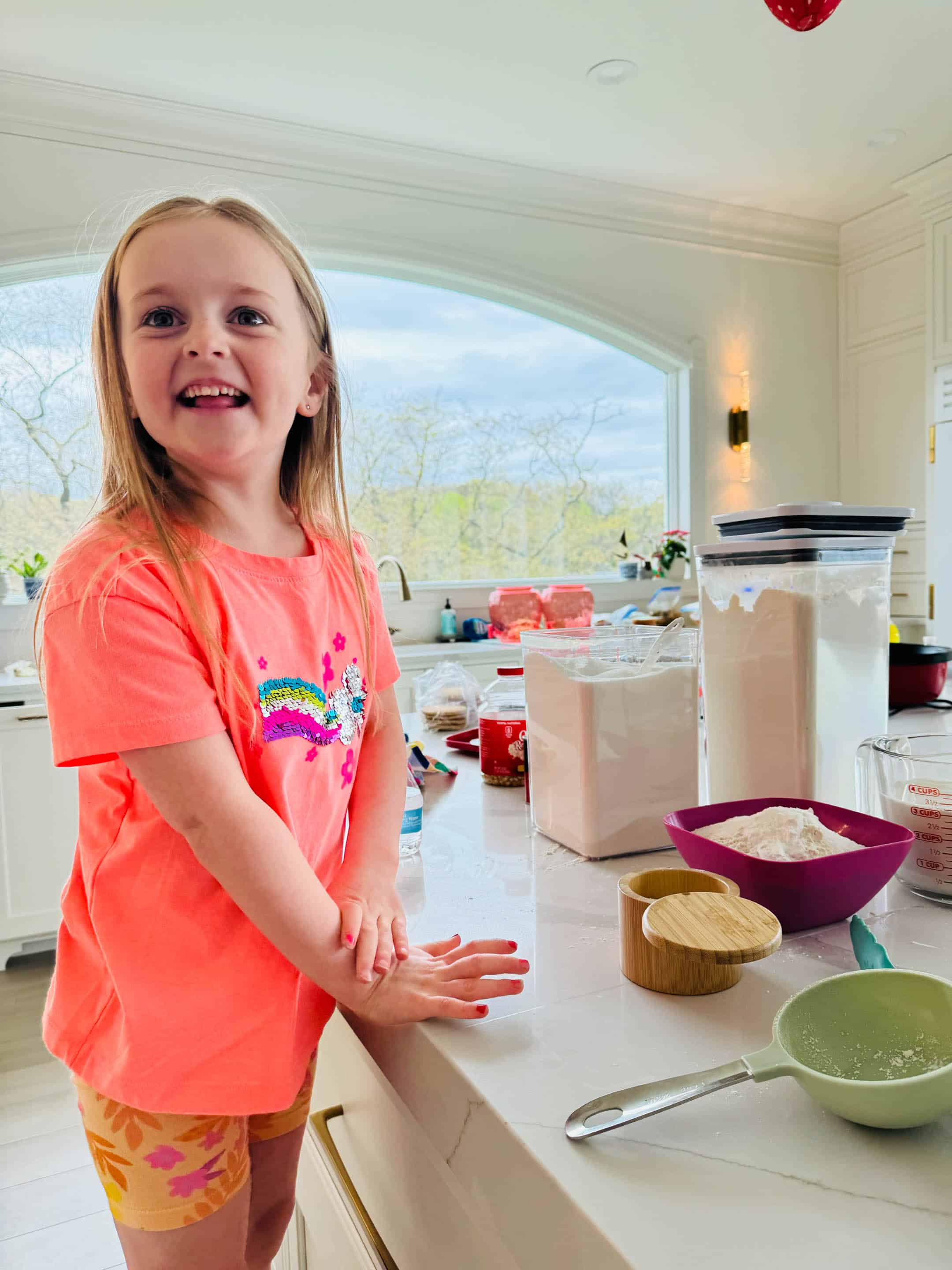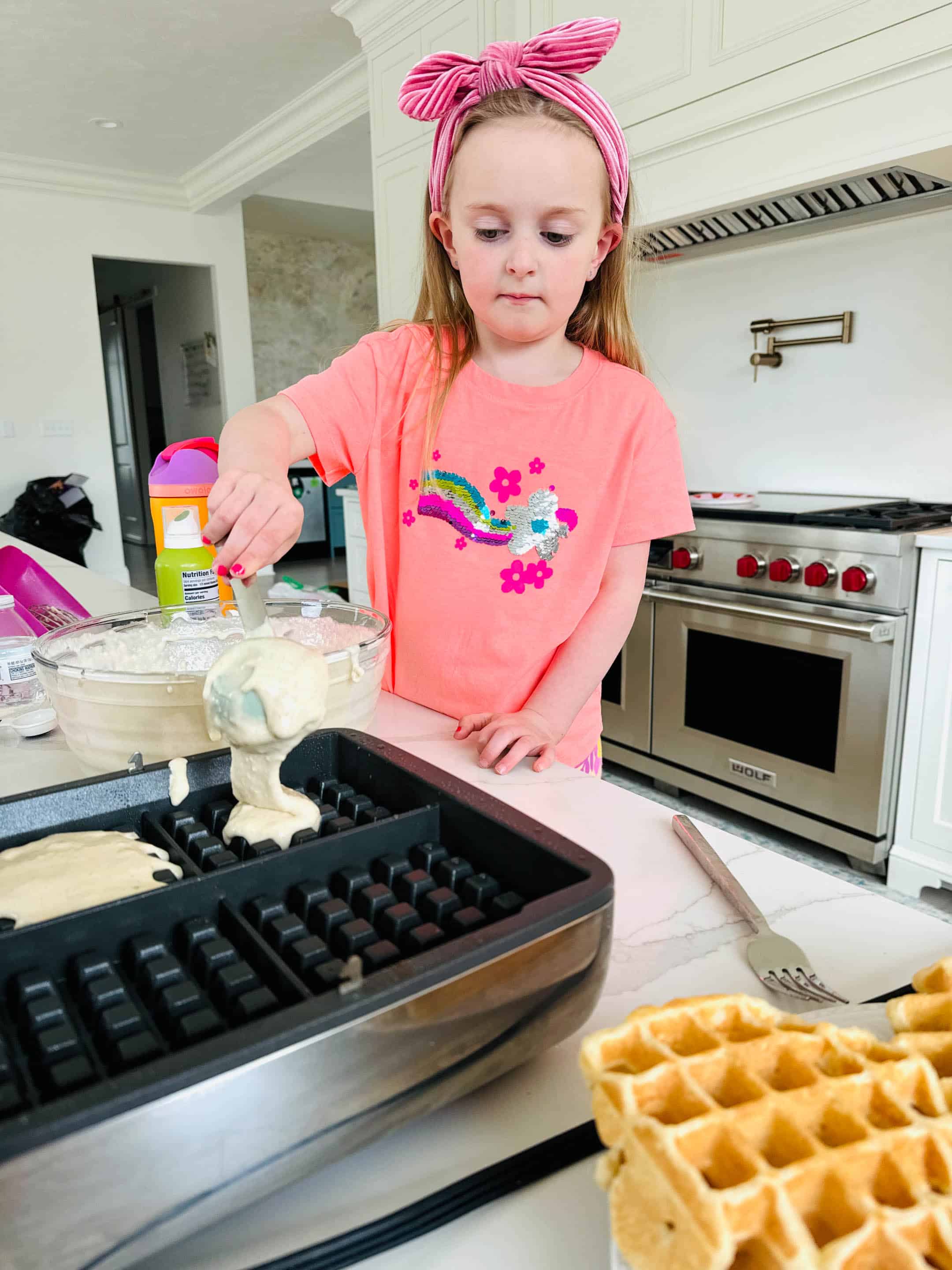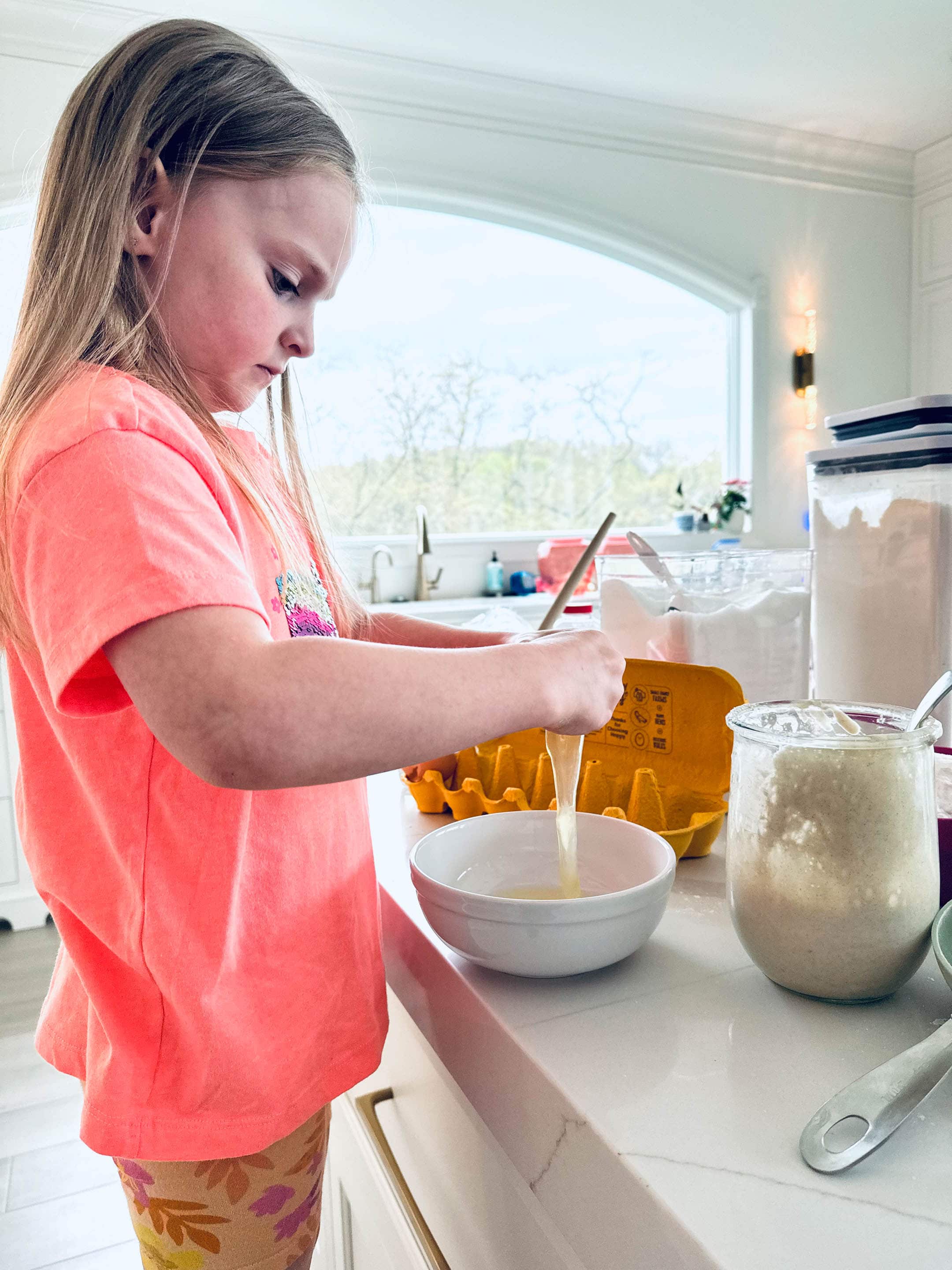 This morning Emilia and I made another big batch of sourdough waffles. Look at her concentration in cracking the egg!