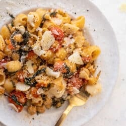A pantry dish that comes to get ridiculously quickly is a staple in our meal plans. This burst tomato pasta is filled with spinach, chickpeas, basil and parmesan. It’s such a great recipe to have in your repertoire.