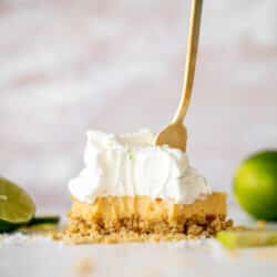 - Slice the bars into squares. Top each with fresh whipped cream (I prefer unsweetened), a sprinkle of flakey salt and fresh lime zest.
