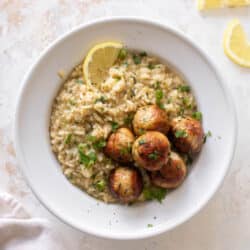 These chicken meatballs are juicy and tender, filled with fresh herbs and so much flavor. They’re served over creamy zucchini risotto that has hints of lemon and green onion. It’s the best combination ever and a swoon worthy meal!