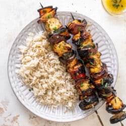 These honey mustard chicken skewers are smoky and tender, loaded with summer garden vegetables and served over jasmine rice.
