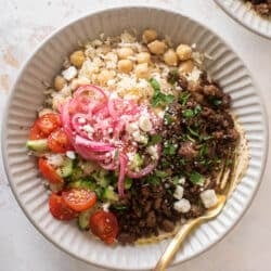 Say hello to my family’s current favorite dinner. These mediterranean beef bowls are super satisfying and so delicious, complete with chickpeas and rice, seasoned ground beef, a tomato cucumber salad and all the hummus.