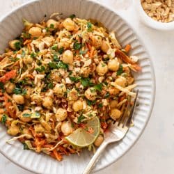 This chickpea crunch salad is super satisfying and a texture lovers’ dream. Cabbage, red peppers, carrots, green onions, chickpeas and cilantro are tossed in a peanut lime dressing. It’s delicious and so crunchy!