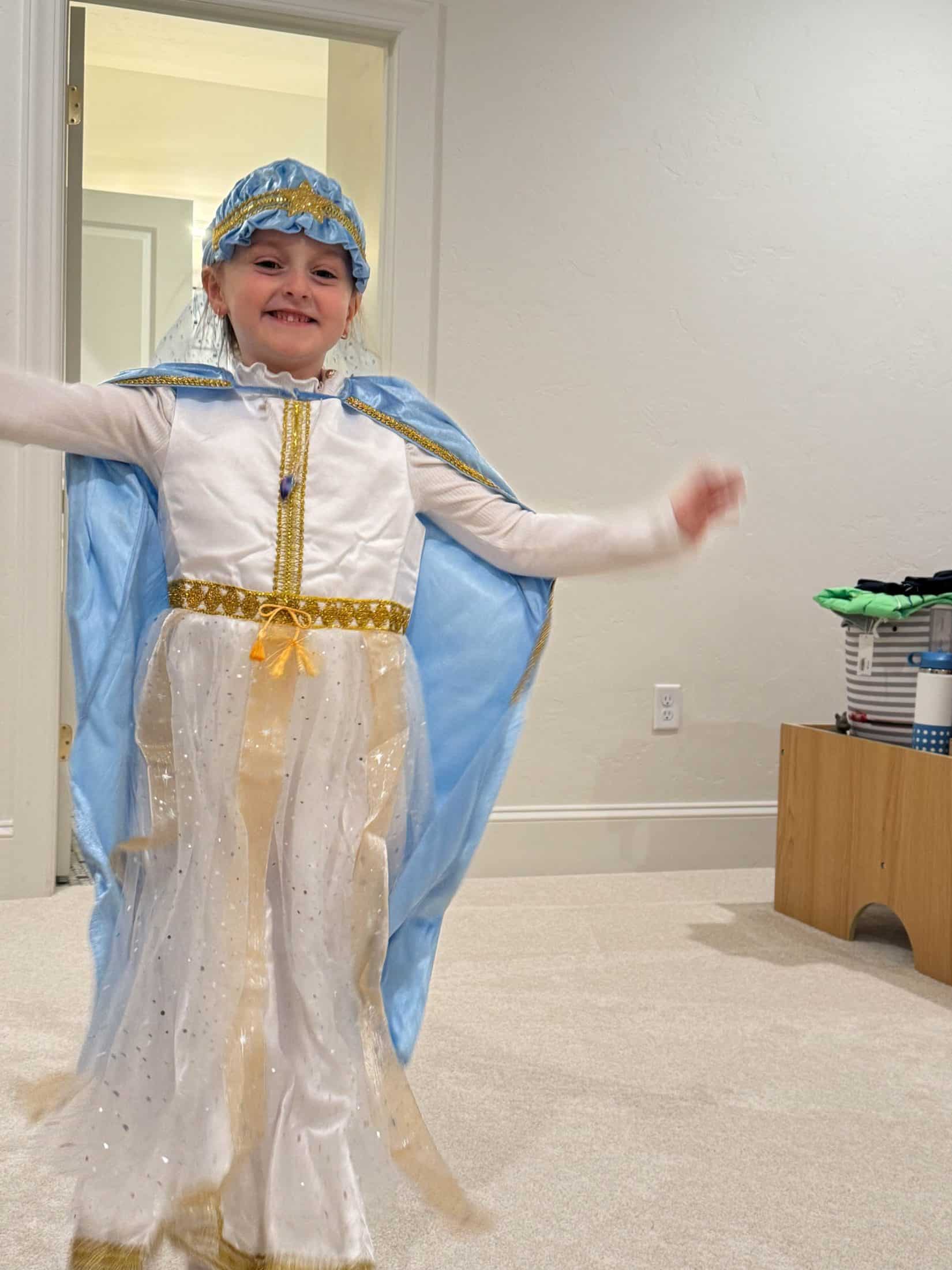 Emilia dressed as Mary for nativity day. She is obsessed.
