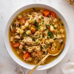 We love this sweet potato chicken noodle soup! Classic chicken noodle soup with tiny pasta and tender chunks of sweet potato. The parmesan broth and hint of fresh lemon make this extra special. It’s super satisfying and flavorful!