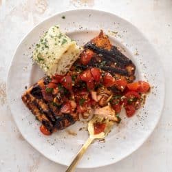 This bruschetta salmon is an easy and versatile weeknight meal. Seared salmon drizzled with syrupy balsamic glaze and topped with diced tomatoes, garlic and fresh basil tastes like summer. Serve with your favorite side dish for a simple dinner!