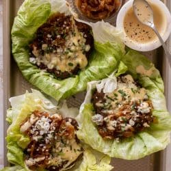 These lettuce wrap burgers are my new favorite burger! Melty blue cheese burgers topped with tons of caramelized onions, a drizzle of creamy honey mustard all wrapped in a lettuce cup. Refreshing, satisfying and crisp!