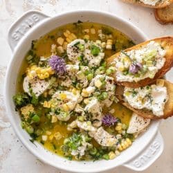 This summer marinated cheese is perfect for a little summer snack. A lovely appetizer made of sliced goat cheese, summer sweet corn, scallions, fresh herbs, a touch of vinegar and more. It’s tangy and herby and seriously so good, you won’t believe it.