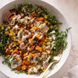 - While the sweet potatoes are still warm, place them on the arugula. Top with the corn, pickled shallots and pepitas. Drizzle with the ranch and serve!