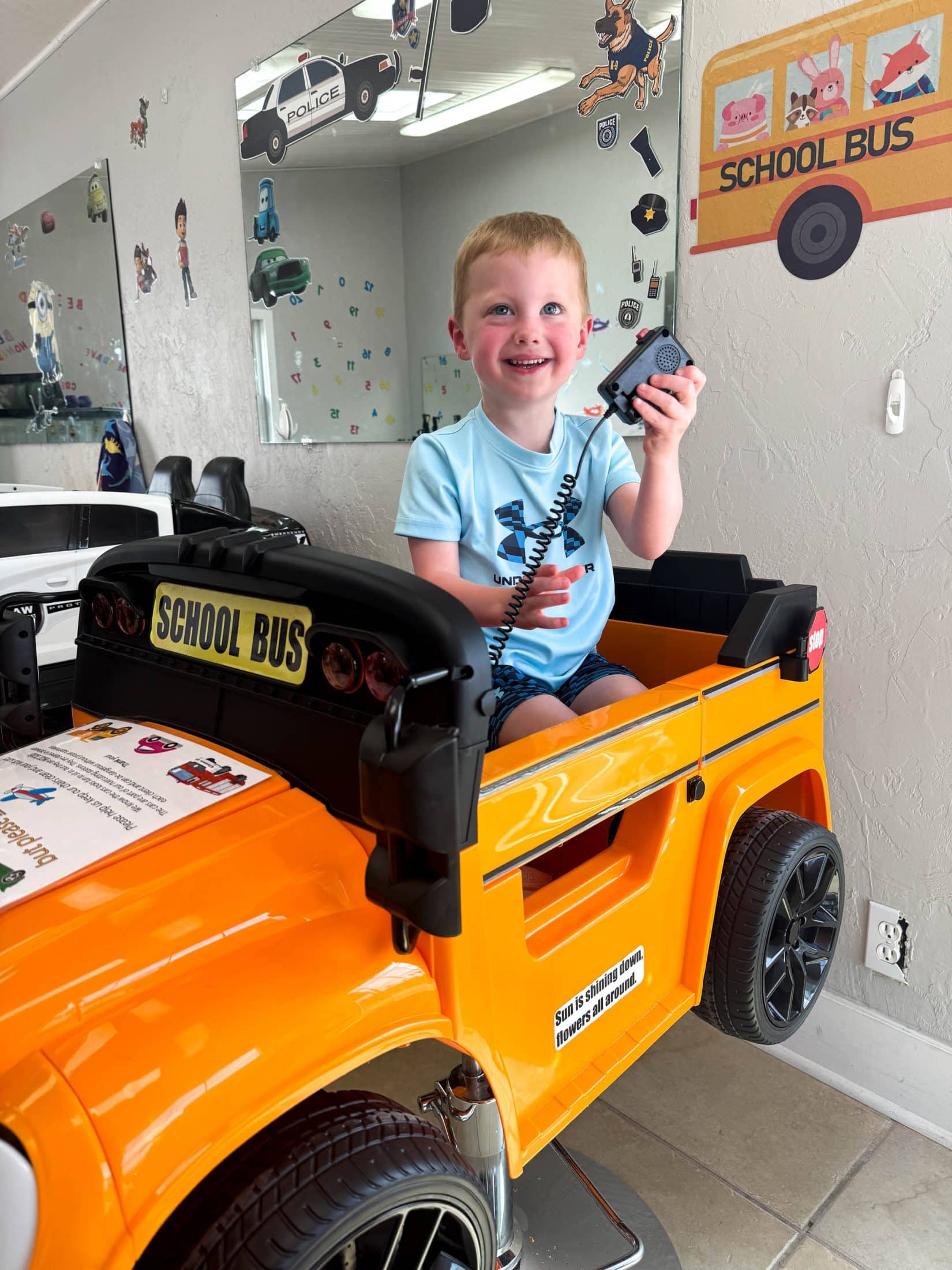 Back to school haircut in a school bus.