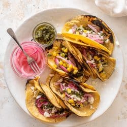 Both the chimichurri and the pickled onions can be made ahead of time. They make the tacos taste so incredibly fresh and tangy. You don’t really need both – the chimichurri is vinegar based already. But the pickled onions always live in my fridge and are just one of our favorite toppings.