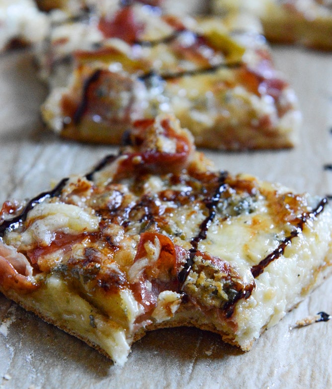 Caramelized Pear Prosciutto and Blue Cheese Pizza