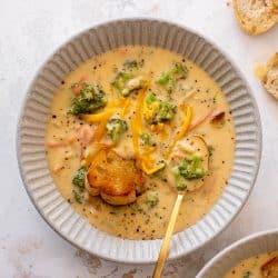 Finally, I like to serve this with some little garlicky toasts. It’s like a giant crouton in the soup and it is SO delicious. Broccoli cheddar soup in a bread bowl is on another level, right? This is like that; the crostini soaks up the soak in the best way and it is just another vehicle to get it into your mouth.
