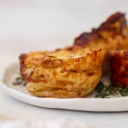 These dauphinoise potatoes are delicious and adorable! Single serving portions of thinly sliced potatoes are layered with cream, gruyere and fontina cheeses, baked until golden and crisp. The inside is tender and melts in your mouth! The outside is cheesy and crisp. Delish!