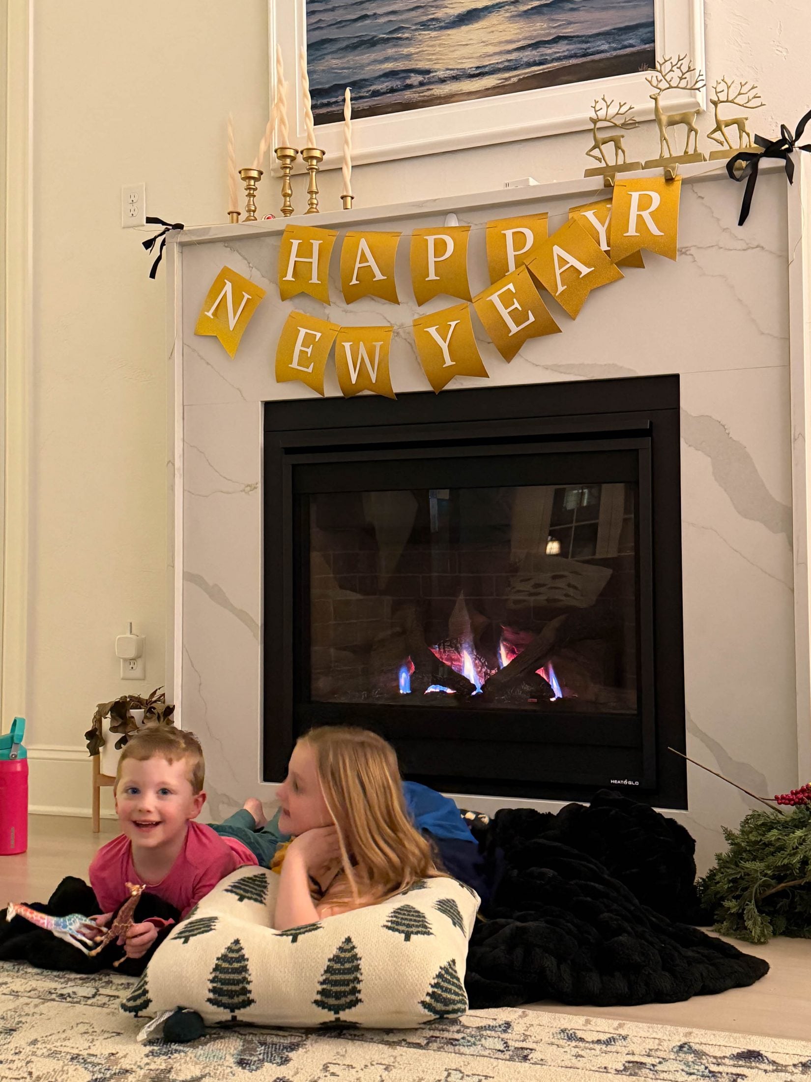 And cuddled by the fire! There is a lot of struggle in this pic. The banner. The candle falling over. My garland on the floor. My dead plant. LOL.