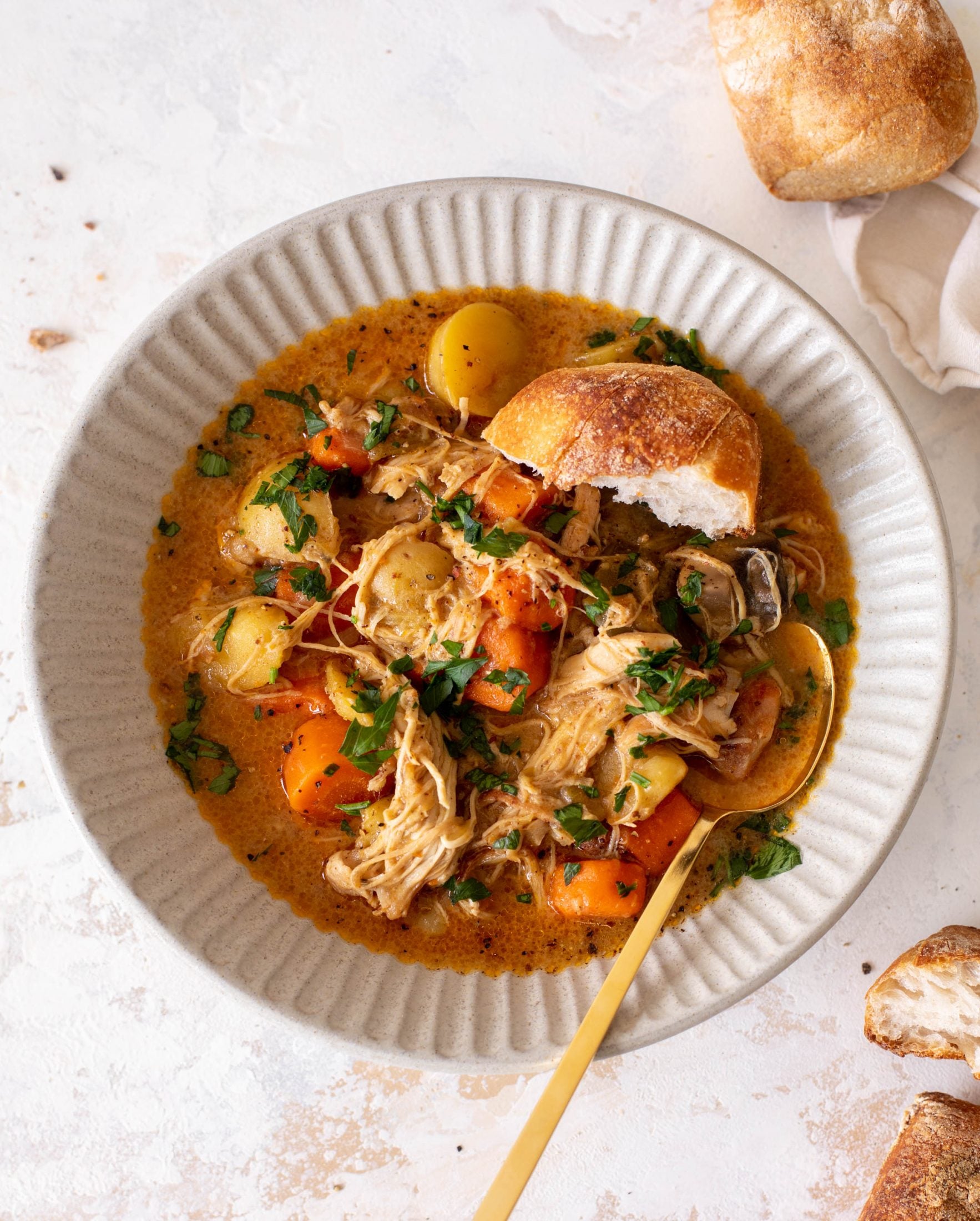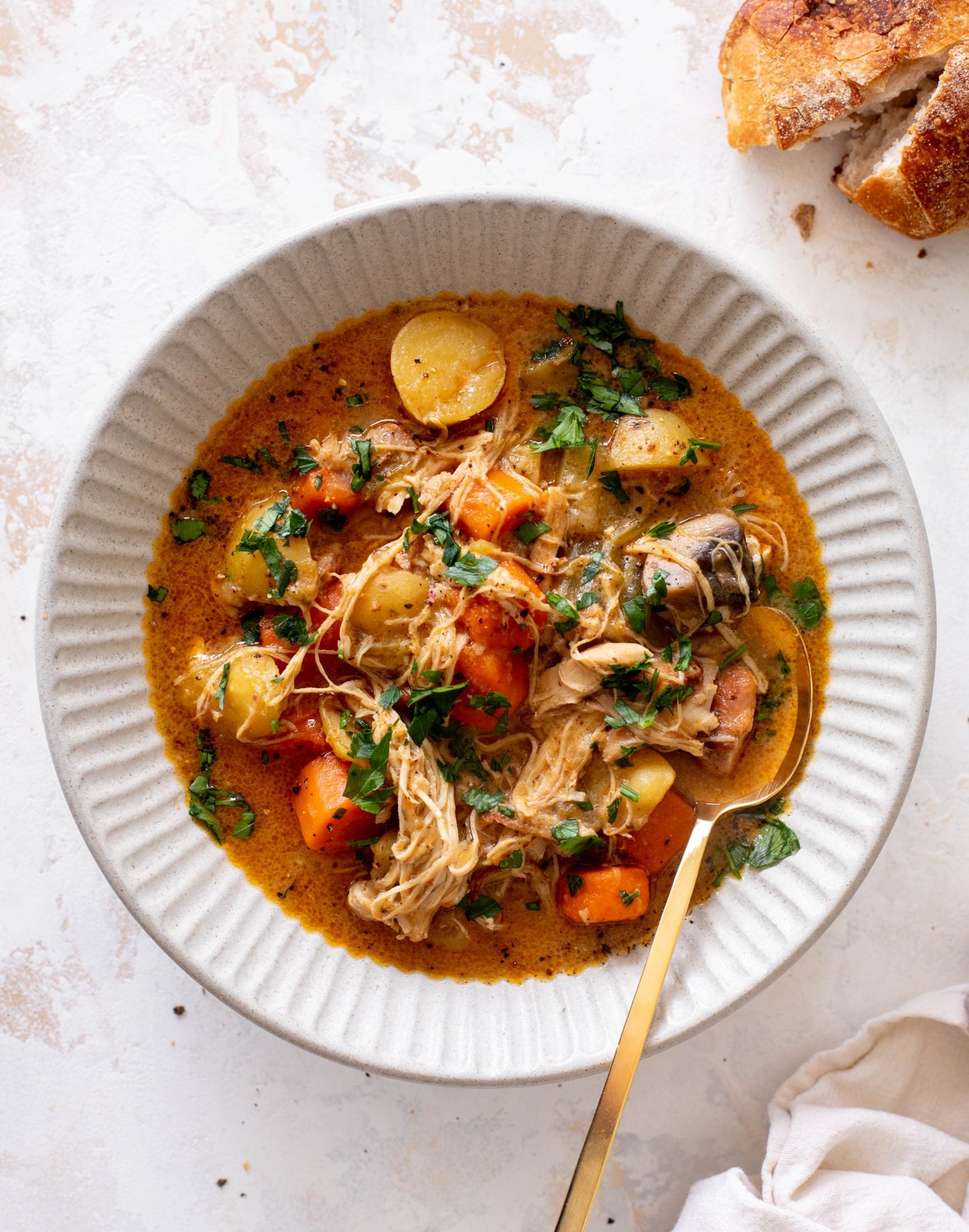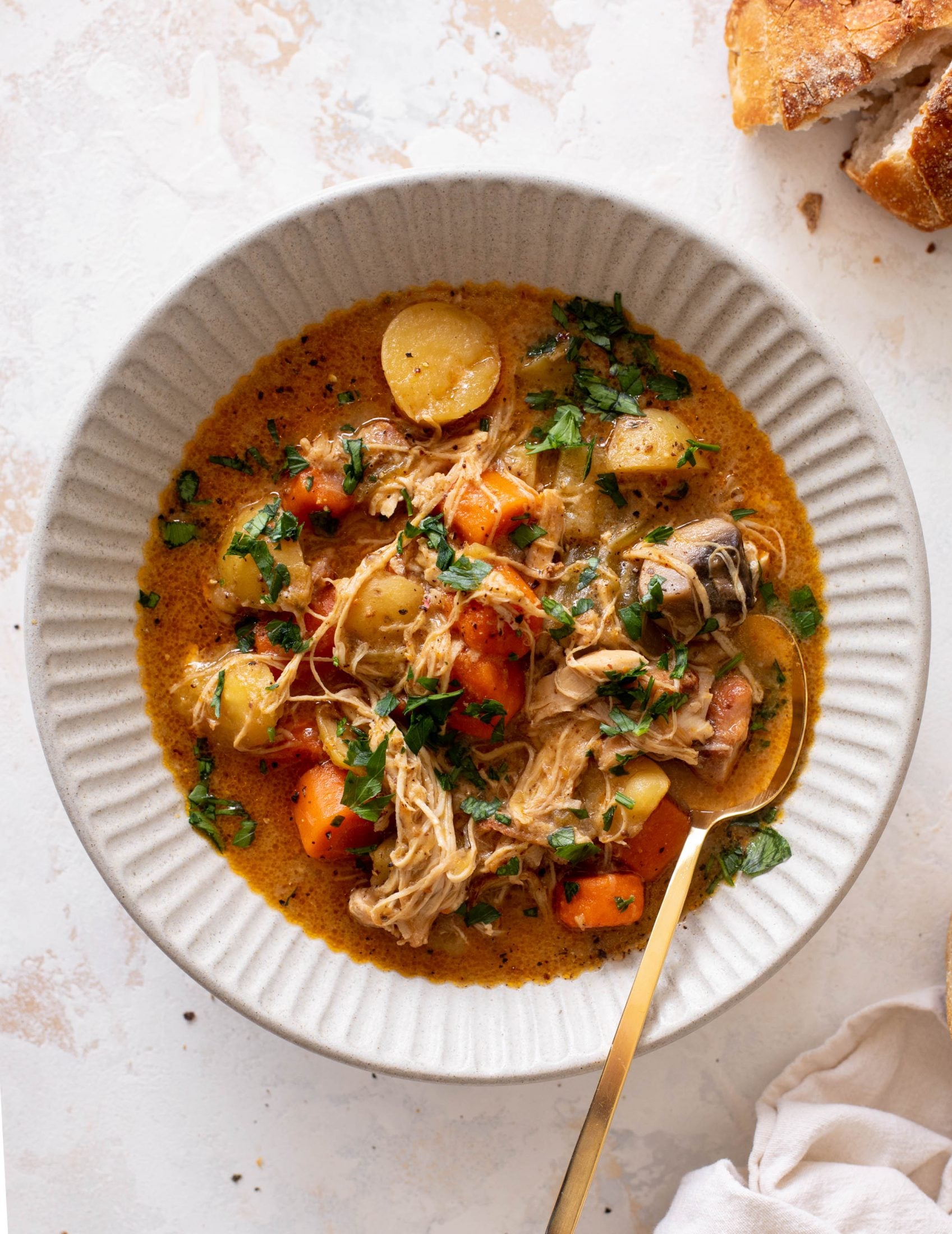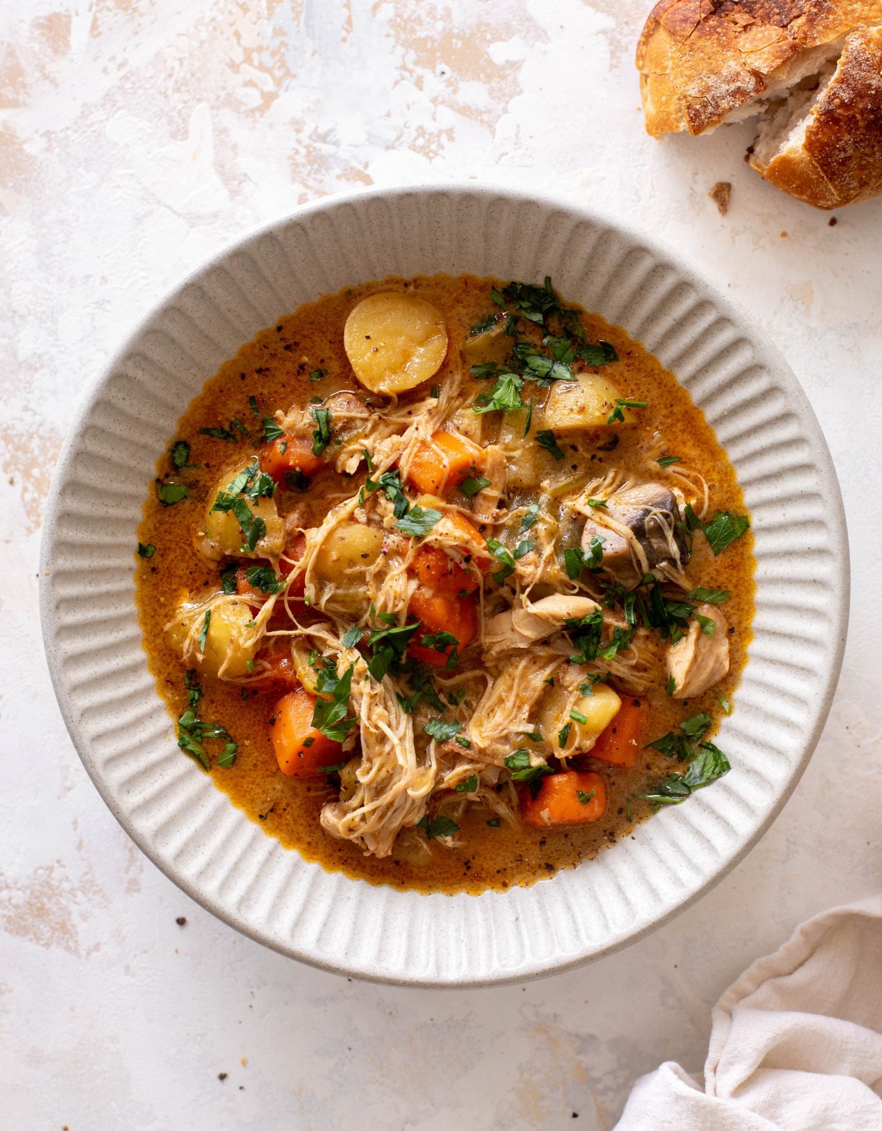This chicken stew is the ultimate comfort food! Cozy and delicious, it’s made with chicken thighs that are fall-apart tender, potatoes, carrots and celery, and is loaded with flavor. It’s incredibly satisfying, soul warming and a giant hug in a bowl.