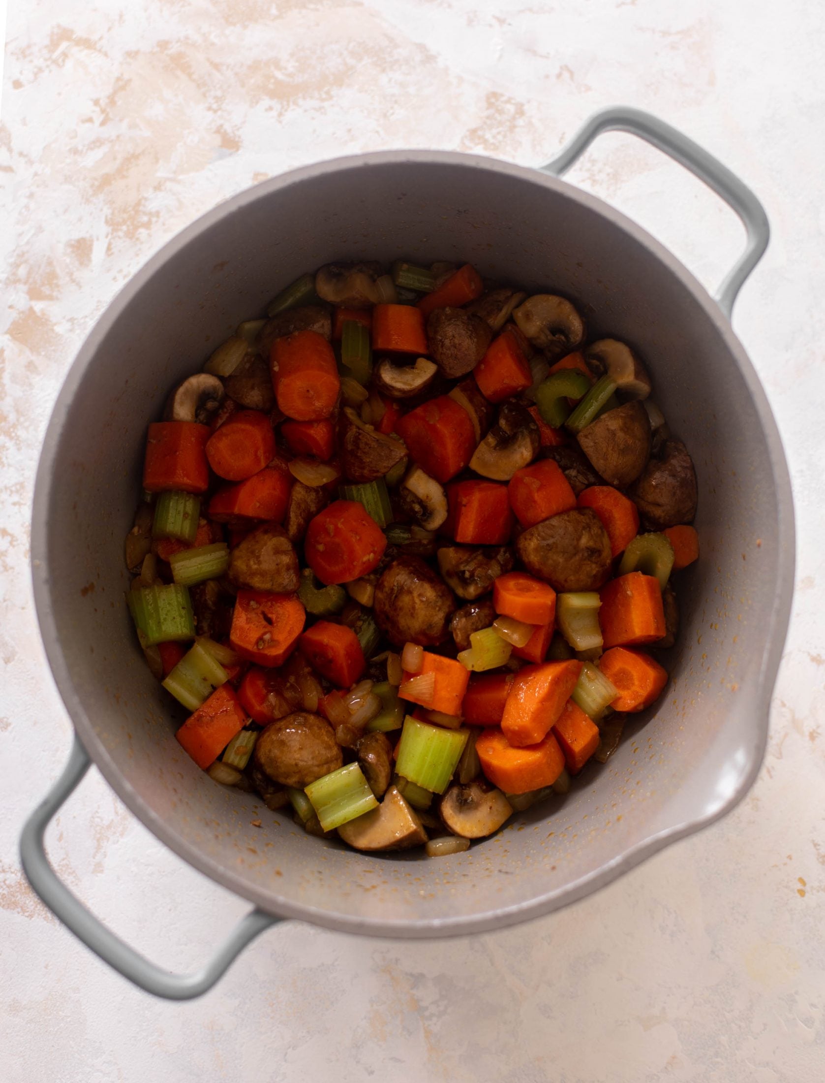 - In the same pot, add in the onions, garlic, carrots, mushrooms and celery. Add another pinch of salt and pepper. Cook, stirring often, until the veggies soften, about 6 to 8 minutes.