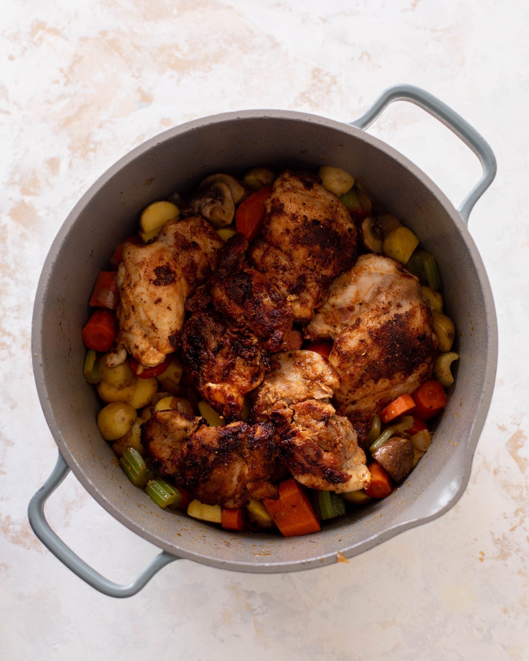 - Add the potatoes, put the chicken thighs back in and cover with chicken stock. Add a few springs of fresh thyme. Bring the mixture to a boil, then reduce it to a simmer and cover. Simmer for 30 minutes, covered, stirring occasionally.