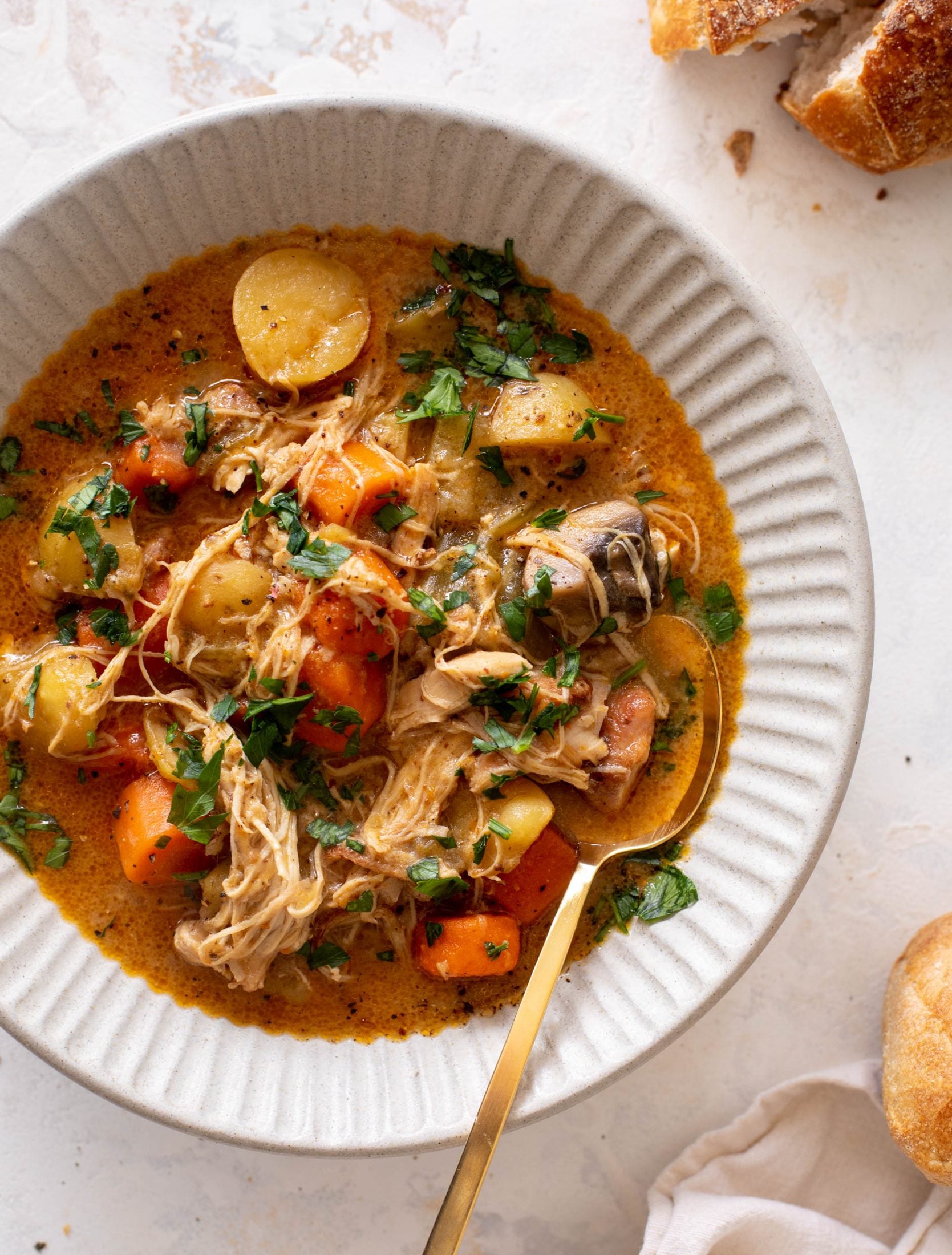 We love a hearty beef stew. It’s what I make most often, but Eddie loves chicken thighs and when I found myself with a pack that had to be used, this is the first thing I thought of. A cozy, comforting stew where the chicken falls apart and is so tender, the broth is rice but not heavy or creamy, the potatoes and carrots just melt in your mouth and the flavor is over-the-top outstanding.