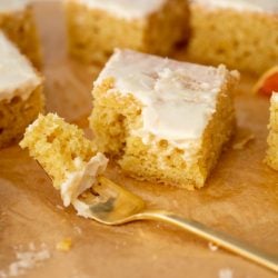 This creamsicle snack cake is dreamy! A tender orange cake made with greek yogurt is blanketed by a vanilla cream glaze. It’s the ideal breakfast treat or afternoon snack!