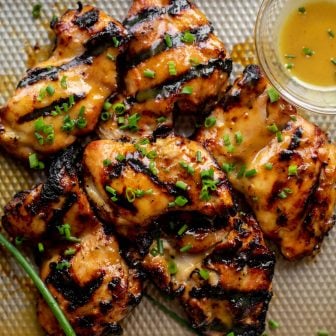 These grilled buffalo chicken thighs are so easy and delicious! Covered in cheddar cheese and served with a grilled corn scallion salad, this meal...