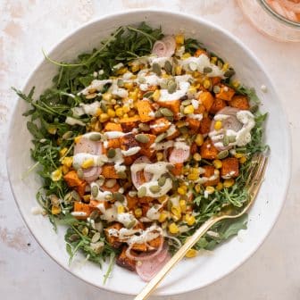 This sweet potato summer salad is a dreamy, satisfying meal! Roasted chili lime sweet potatoes with peppery arugula, pickled shallots, sweet corn, roasted pepitas...