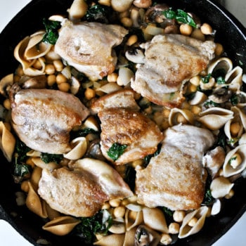 Chicken, Kale + Chickpea Skillet serves 2-4 1.75 pounds boneless, skinless chicken thighs 3/4 teaspoon salt 3/4 teaspoon pepper 3 tablespoons olive oil 1...