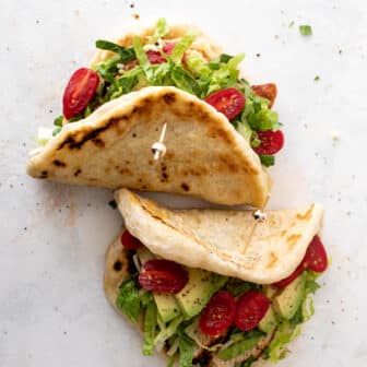 We adore these chicken avocado sandwiches! Served on fried pizza bread, they are filled with roasted red pepper mayo, lettuce, tomato and cheese. Super...
