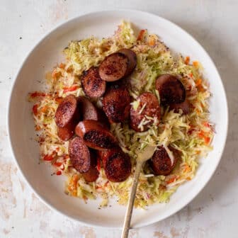 This smoked sausage salad is delicious! Refreshing and crunchy cabbage slaw with red onion, red pepper and carrots, drizzled in a perfect vinaigrette. It’s...