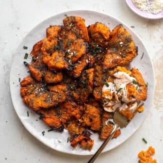 The best crispy ranch sweet potatoes!! These smashed sweet potatoes are sprinkled with ranch seasoning, roasted until crispy and served with homemade ranch on...
