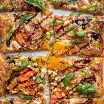 We adore this caprese puff pastry! Flaky puff pastry is layered with fresh basil pesto, juicy ripe tomatoes, fresh mozzarella cheese and a balsamic...