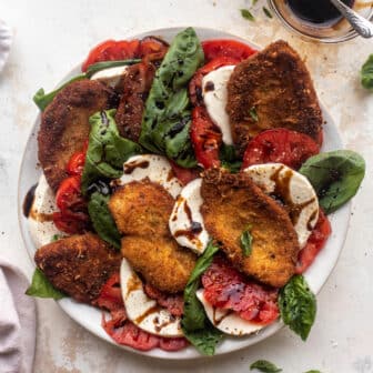 This crispy chicken caprese is a delicious summer meal! Tender, thin and crispy chicken cutlets layered with heirloom tomatoes, fresh mozzarella cheese and basil....