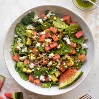 This watermelon crunch salad is so summery and delicious! A spinach arugula based is topped with fresh watermelon, avocado, goat cheese, pickled onions and...