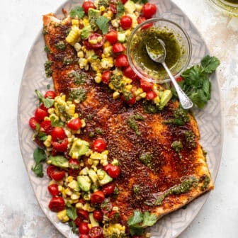 This summer salmon recipe is my favorite! Grilled blackened salmon served with herby chimichurri and a tomato corn salad. It’s delicious and satisfying! Summer...
