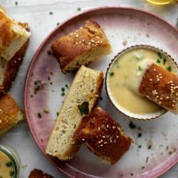 Sesame Pretzel Focaccia with Dijon Beer Cheese.