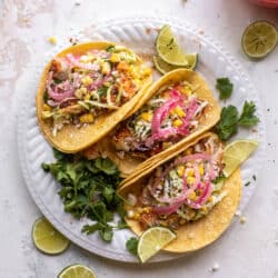 Grilled Fish Tacos with Jalapeño Corn Slaw.