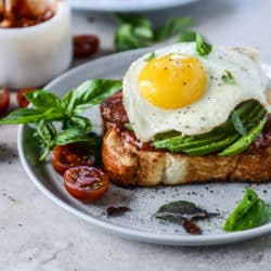 Avocado, Bacon and Egg Toast with Quick Tomato Jam.