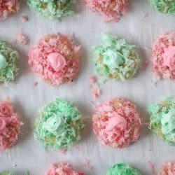 Dip each dough ball in the egg white. Roll into the pink and green coconut. Place the balls on a cookie sheet about 1 inch apart. These don't spread much!